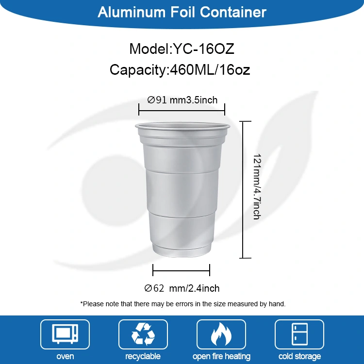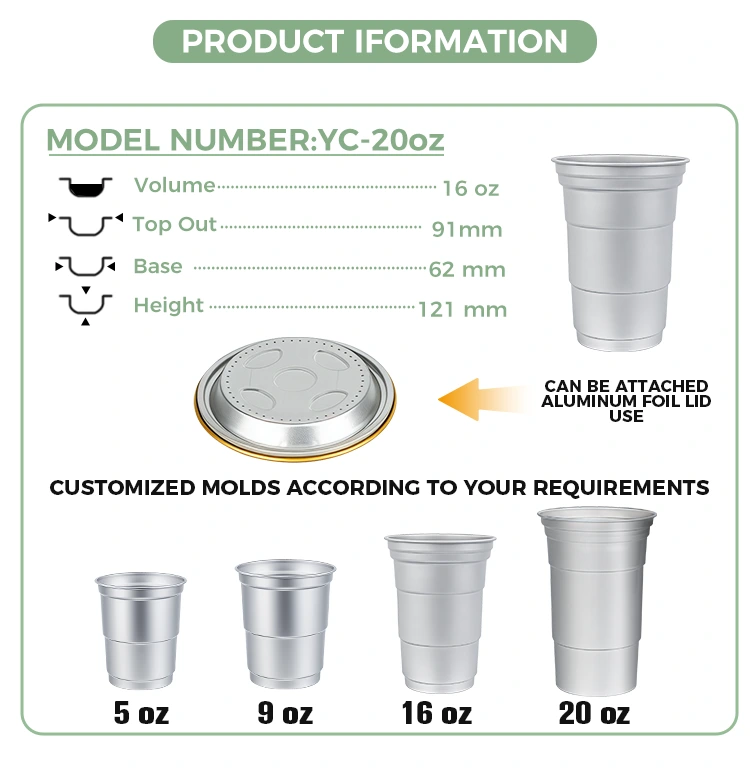 Юнчу - Қытайдың жетекші 16 унция бір рет қолданылатын алюминий фольга сусынының шыныаяқ өндірушісі. Бұл 16 унция бір рет қолданылатын алюминий фольгадан жасалған ішуге арналған шыныаяқ кофе және сыра сияқты стандартты сусындарға жарамды 460 миллилитрлік алюминий фольгадан жасалған шыныаяқ. Ол стандартталған дизайнмен ерекшеленеді және негізінен жиі теңшеу қажеттілігі бар кофеханалар мен қолөнер барлары сияқты коммерциялық пайдаланушыларға бағытталған. Тиімді жылу өткізгіштік пен негізгі тығыздау өнімділігін қамтамасыз ете отырып, бұл 16 унция бір рет қолданылатын қайта өңдеуге болатын алюминий фольгадан жасалған сусынға арналған шыныаяқ брендті жылдам және икемді визуалды теңшеу қызметтеріне көп көңіл бөледі.