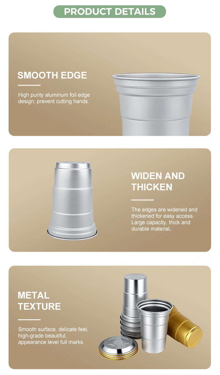 Бұл 16 унция бір рет қолданылатын алюминий фольгадан жасалған сыра мен кофе сусынына арналған шыныаяқты тоңазытқышта сақтау үшін тікелей тоңазытқышқа салуға болады. Салқын сусындарды сақтау кезінде алюминий материалының жылу өткізгіштігі суық температураны сақтауға көмектеседі.