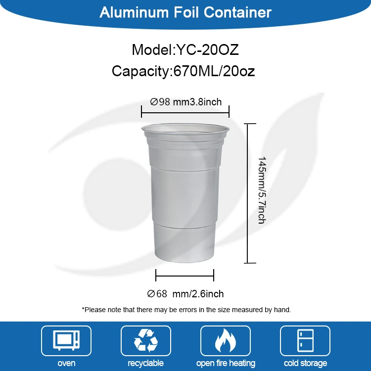YUNCHU - Қытайдың сапасы 20 унция бір рет қолданылатын қарапайым алюминий сусынының шыныаяқ өндірушісі. Бұл көп функциялы 20 унция бір рет қолданылатын алюминий тостаған, бір бөліктен тұратын тағамдық алюминий фольгасынан жасалған қарапайым алюминий сусынға арналған шыныаяқ. Ол жеңіл, берік және 100% қайта өңдеуге қабілетті. Оның тамаша жылу өткізгіштігі оны суық және ыстық сусындарға жарамды етеді. Жабық қақпақ ағып кетуді тиімді болдырмайды. Бұл теңшелетін 20 унция бір рет қолданылатын алюминий сусыны үшін шыныаяқ кофе алу, ашық кемпинг және мерекелік кештер сияқты әртүрлі сценарийлер үшін де қолайлы және түстер, логотиптер және қалыптарды теңшеу қызметтерін ұсынады.