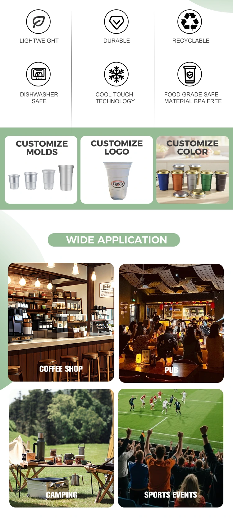 Бұл өнімнің негізгі артықшылығы оның берік және жеңіл құрылымында және әртүрлі сценарийлерде жан-жақты қолданылуында: ол қысым мен деформацияға төзімді, алып жүруге және тасымалдауға оңай ғана емес, бұл көтерме 20 унция бір рет қолданылатын алюминий тостаған қарапайым алюминий сусынға арналған шыныаяқтарды, сонымен қатар оны әртүрлі тығыздағыш қақпақтармен және сенімді алюминий қақпақтарымен жұптастыруға болады. ағып кетпейтін, кофеханалар, барлар, кемпингтер, спорттық іс-шаралар және басқа да жағдайлар үшін өте қолайлы. Оған қоса, біз брендтердің жеке қажеттіліктерін қанағаттандыру үшін түсті, логотипті басып шығарудан бастап эксклюзивті қалыптарды әзірлеуге дейінгі терең теңшеу қызметтерін ұсынамыз және дәстүрлі бір рет қолданылатын шыныаяқтарға балама ретінде сізге экологиялық таза және жоғары сапалы шешім ұсынуға дайынбыз.