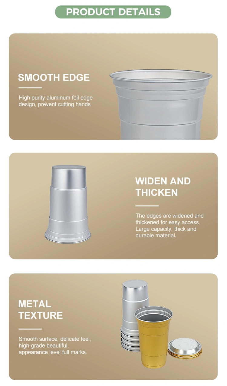 YUNCHU 20 унция бір рет қолданылатын қарапайым алюминий сусынды шыныаяқ заманауи сусын қажеттіліктері үшін арнайы жасалған. Шыныаяқ корпусы жоғары таза тағамдық бастапқы алюминий фольгадан жасалған, BPA жоқ және ешқандай иіссіз қауіпсіз. Бірегей тегіс оралған жиек және қалыңдату процесі ыңғайлы ұстауды қамтамасыз етеді және кесуді болдырмайды. Бұл 20 унция бір рет қолданылатын қарапайым алюминий кешке арналған шыныаяқ