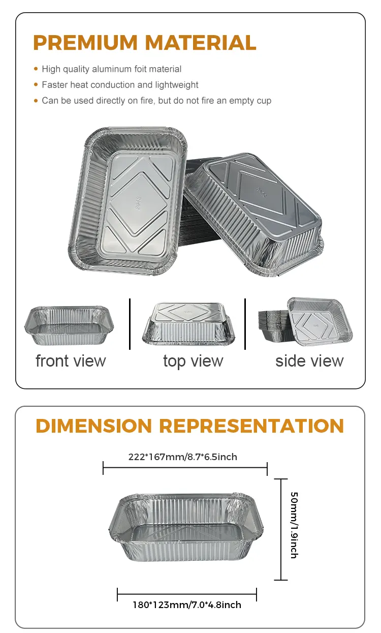 Юнчу алюминий фольга зауытының бір рет қолданылатын барбекюге арналған түскі ас қорабы күміс алюминий фольга контейнері барбекю мейрамханасы, батыс мейрамханасы, үйде дайындалған мейрамхана немесе наубайхана болсын, көптеген көріністерге жарамды, бұл күміс алюминий фольгадан жасалған түскі ас қорапшасы тиімділікті арттырады. Барбекю мейрамханалары оны тікелей грильде пісірілген шашлықтар, гриль көкөністер және грильдегі теңіз өнімдерін ұсыну үшін пайдалана алады. Күмістей көрініс хош иісті ингредиенттермен үйлеседі. Ол толық визуалды әсерге ие және қызмет көрсету кезінде көздің жауын алады. Таза емес дизайн ас үйдегі ыдыс жуудың жүктемесін азайтады және еңбек шығындарын үнемдейді. Бұл әсіресе ас ішудің ең жоғары кезеңінде жылдам тамақтану үшін қолайлы. Наубайханалар оны пісірілген торттарға, жұмыртқа торттарына және печеньелерге қызмет ету үшін пайдаланады. Оларды пеште тікелей пісіруге болады және пісіргеннен кейін пісірудің қажеті жоқ. Пластиналарды ауыстыру және оларды тікелей сатуға қою тәттілердің температурасы мен пішінін сақтай отырып ыңғайлы; Үйде дайындалған мейрамханаларды алып кету үшін пайдалануға болады, ал ағып кетпейтін дизайн сорпаның төгілуін тиімді болдырмайды. Алюминий фольгасының жылуды сақтауы тағамның тұрақты температура уақытын ұзартуы мүмкін. Кемпингтерге, пикниктерге, ашық барбекюлерге және үлкен ыдыс-аяқты алып жүру және тамақтан кейін тазалау қиындықтары үшін бұл бір рет қолданылатын алюминий фольгадан жасалған түскі ас қорапшасы ашық ауада саяхаттаудың ауыр нүктелерін тамаша шешеді. Материал жұқа және жеңіл, оны сақтау оңай. Оны өз қалауыңыз бойынша бүктеуге және жинауға болады, сөмкеңізде орын алмайды және оны тасымалдауда қиындықсыз етеді.