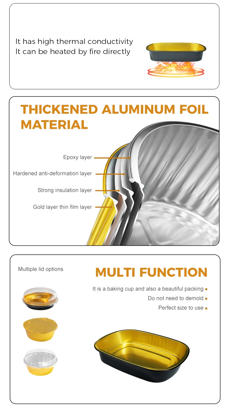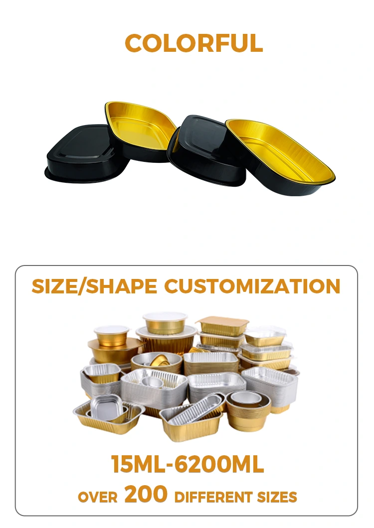Yunchu алюминий фольга фольгамен жабдықтаушы Төртбұрышты алюминий фольга контейнерлері, әсіресе пісіру, тамақтану тізбегі және басқа сценарийлерден, биіктігі төмен және кейбір түріктер, гриль балық, бұқтырылған, бұқтырылған, бұқтырыңыз, мүмкін Алюминий фольга қақпағын және үй жануарларын толығымен мөлдір қақпақтармен және үй жануарлары толығымен мөлдір қақпақтармен, өте тығыздау, жоғары температураға төзімділігі мен май және ағып кетудің алдын-алу функциясы бар. Ол тағамды қаптастыру, жылыту, тоңазытқыш және түсіру сияқты түрлі сценарийлерде кеңінен қолданылады. Беті жарық пен тегіс келбеті бар, ол жылу платерленген пленканы автоматты түрде герметизациялауға ыңғайлы, яғни қаптаманың тиімділігін арттырады.