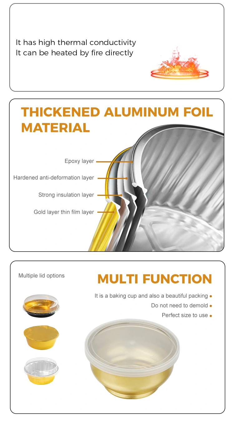 Yunchu алюминий фольга жеткізушісі, бір реттік алтын ыдыс алюмені алюминий фольга контейнерлері, қалыңдатылған алюминий фольгасы, қатты ыстыққа төзімді, күшті, жоғары деңгейлі зарарсыздандыру, алюминийден жасалған алюминийге де қызмет етілуі мүмкін, гигиеналық және жақсы жылу оқшаулау қасиеттері бар Бумен пісірілген, тоңазытылған, мұздатылған және қайта өңделетін. Азық-түлік сұрыптағы ішкі мембрана, металлдан жасалған мембрана, герметсіз және иіссіз қалың құмыралармен, сондай-ақ бөтелкедегі және сенімділікпен жұптастырылған, қатты қорғаныс, тығыздау Өнімнің балғындығын ұзақ уақыт, қауіпсіз, экологиялық таза және иіссіз етеді. Бір рет қолданылатын дөңгелек ұсақ алтын ыдыс алюминий фольга контейнерлері азық-түлік өнімдері, кәмші зауыттар, кептірілген жемістерді сұрыптау дүкендері, кәмпит, бал, кептірілген өрік, кептірілген жемістер, қарт мандарин қабығы, қатты, сұйық және қатты зат.