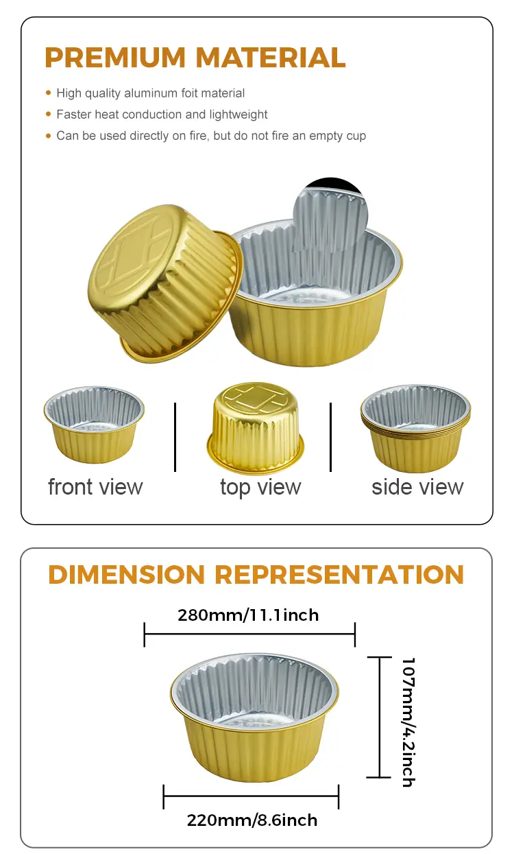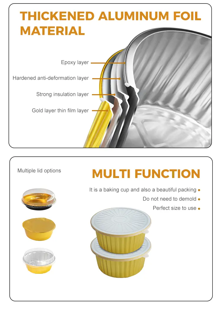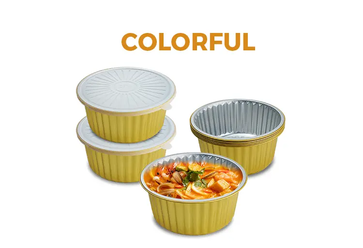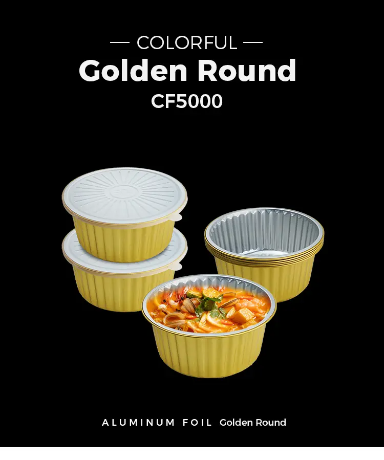 • Бір рет қолданылатын герметикалық алтын дөңгелек алюминий фольга контейнерлеріБір рет қолданылатын герметикалық алтын дөңгелек алюминий фольга контейнерлері