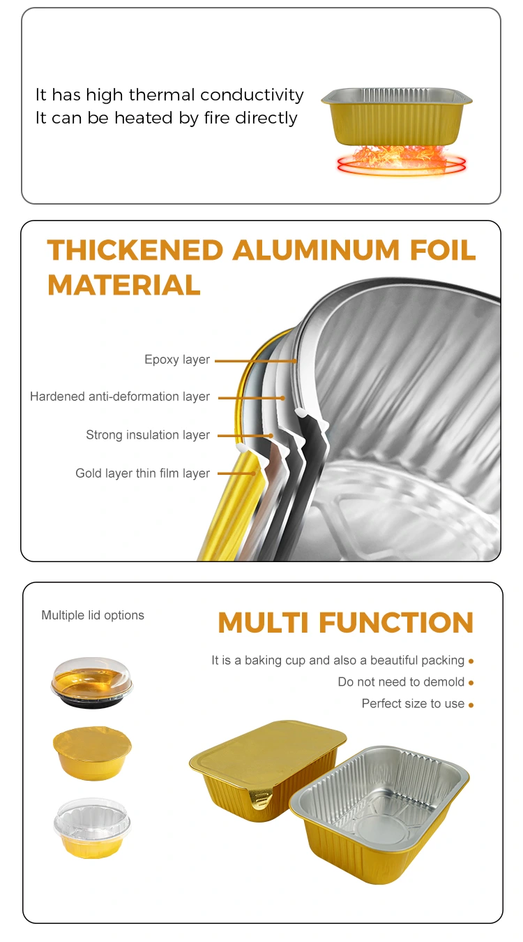 Yunchu алюминийі фольга фольга Жеткізуші гратині Гратин гратині Алюминий фольга контейнерлері жоғары сапалы азық-түлікке арналған контейнерлер жоғары сапалы азық-түлікке арналған алюминий фольгаларынан жасалған, оны герметикалық өнімділігі, жоғары температурасы жоғары және май және ағып кетеді. Ол тағамды қаптастыру, жылыту, тоңазытқыш және түсіру сияқты түрлі сценарийлерде кеңінен қолданылады. Беті жарық қабырғаларымен жасалған, ал сыртқы түрі тегіс және тегіс, бұл ораудың тиімділігін арттыру үшін жылу тығыздайтын пленканы автоматты түрде герметизациялауға ыңғайлы.