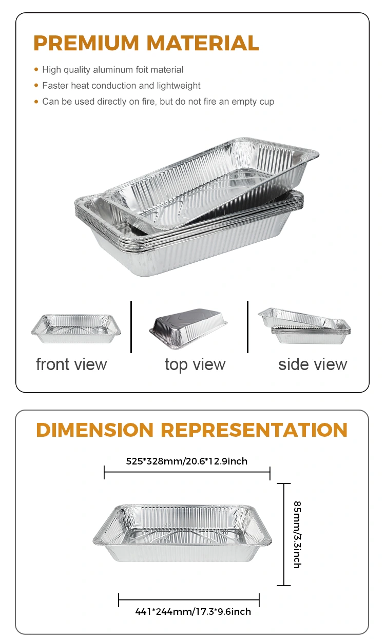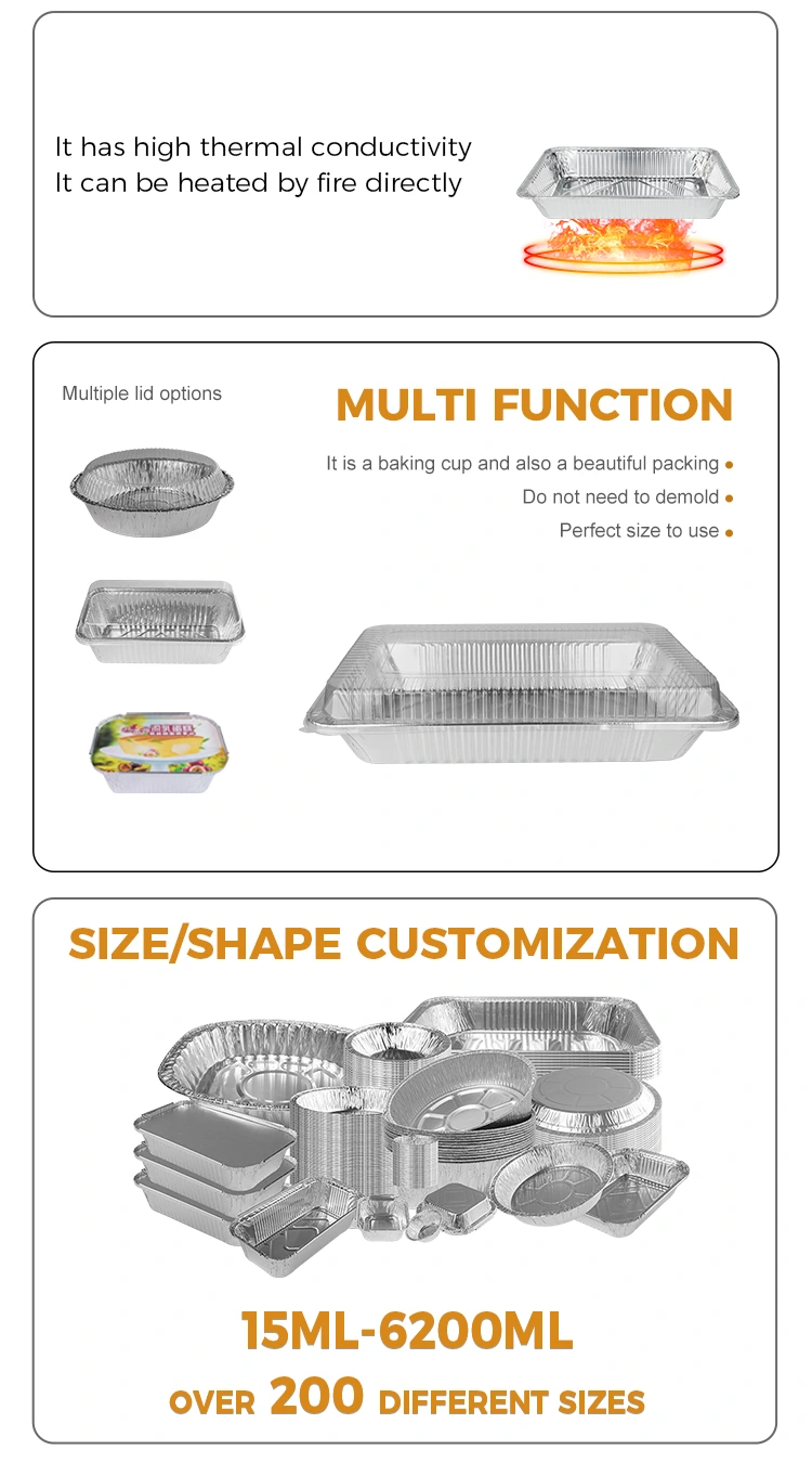 Ерекшеліктері: Сыртқы қуаттылығы Сыртта күміс фольга контейнері 8011-0 фольга-фольга материалынан жасалған, ол тағамдық деңгейдегі байланыс стандартына толық сәйкес келеді, бұл азық-түлік стандарттарына сәйкес келеді, бұл азық-түліктің қауіпсіздігін қамтамасыз етеді, сонымен қатар тағамдық қауіпсіздікті қамтамасыз етеді және қолдануға сенімді. Онда қолдануға қауіпсіз конкейнер және дөңес ішкі дизайн бар. Жабдық тазаламайды және жабдықты ұңғыларды жақсы қорғайды. Ашық жалынды пісіру немесе қыздыру болсын, контейнер деформациясы немесе тамақ қауіпсіздігіне әсер етудің қажеті жоқ.