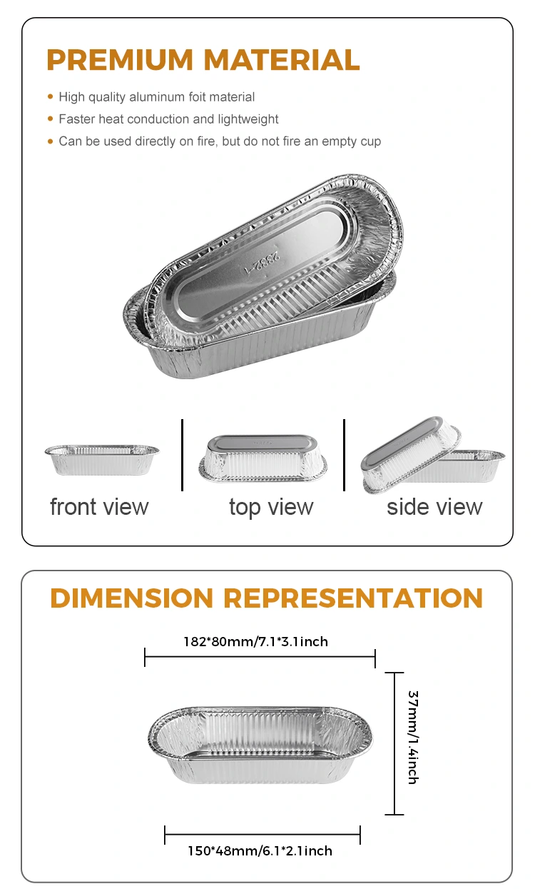 Yunchu алюминий фольга Жеткізуші Сопақша Сопақша Плейерді пісіру Күміс алюминий фольга контейнерлері - бұл бумен пісіруге, қайнатуға, пісіруге, пісіруге, пісіруге, пісіруге және басқа да мақсаттарға, тұздықтарға, кішкене кондикаттарға, ұсақ кондикаттарға және пісіру үшін үлгілерді алуға болады. 8011-0 ТҮРЛЕРІ Алюминий фольга материалы, созылуға төзімділік және коррозияға қарсы тұрақтылығы жақсы созылу, ұзартылған және артқы жартылай шеңберлі дизайн қолдарына, біріктірілген қалыптауға, қабырға бетінің тегіс, қабырға беті әртүрлі сценарийлерде қолдануға жарамды.