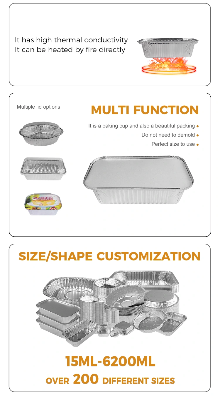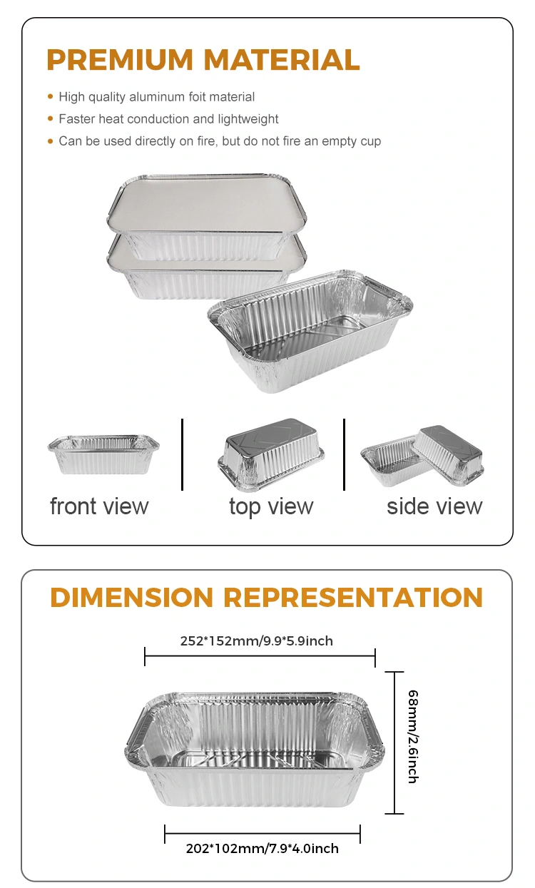 Yunchu алюминий фольгасы Бұл тікбұрышты ауаны қуырғыштың орамалығы Күміс алюминий фольга контейнерлері жоғары сапалы 811 алюминий фольктан жасалған, ол өте жақсы жылу оқшаулағыш өнімділігі бар және тағамның температурасын тиімді ұстай алады, тағамды дәмді және дәмді етеді. Сонымен қатар, тікбұрышты BBQ күміс алюминий фольшталған контейнері сонымен қатар жылуды сақтау функциясымен жабдықталған, оған оны алюминий фольга қақпағы немесе үй жануарларының пластикалық қақпағы арқылы сәйкестендіруге болады, бұл жеке логотипке ыңғайлы және осылайша брендтің кескінін жақсартады.