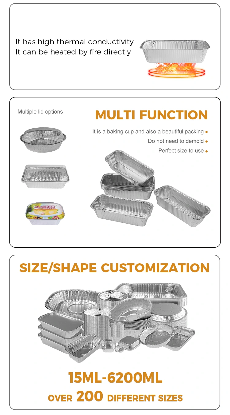 Yunchu алюминийі жеткізушісі ұсынған 2325 тікбұрышты ұшқыштың күміс фольга контейнері, ол ашық ауада барбекю немесе отбасының жиналуы ма, жоқ па. Саудагерлер өз қажеттіліктеріне сәйкес оларды теңшей алады және оларды қажеттіліктеріне қарай басып шығара алады, бұл контейнерлерде ашық жалынның жылытуы мен жылуды жылыту, тағамды біркелкі өткізетін және табаны біркелкі қыздыратынын және табаға жабыспайтынын қамтамасыз етеді. Оны ауаны қуырғышқа салып, бірден қолдануға болады, ал төменгі жағындағы вагон және дөңес дизайн үйкеліс пен құлдырауды болдырмайды. Тараптардың қаттылары өнімнің салмағын арттырады, ал гемспана дизайны қақпағышқа сәйкес келмейді, тағамның температурасында тиімді бекітілген.