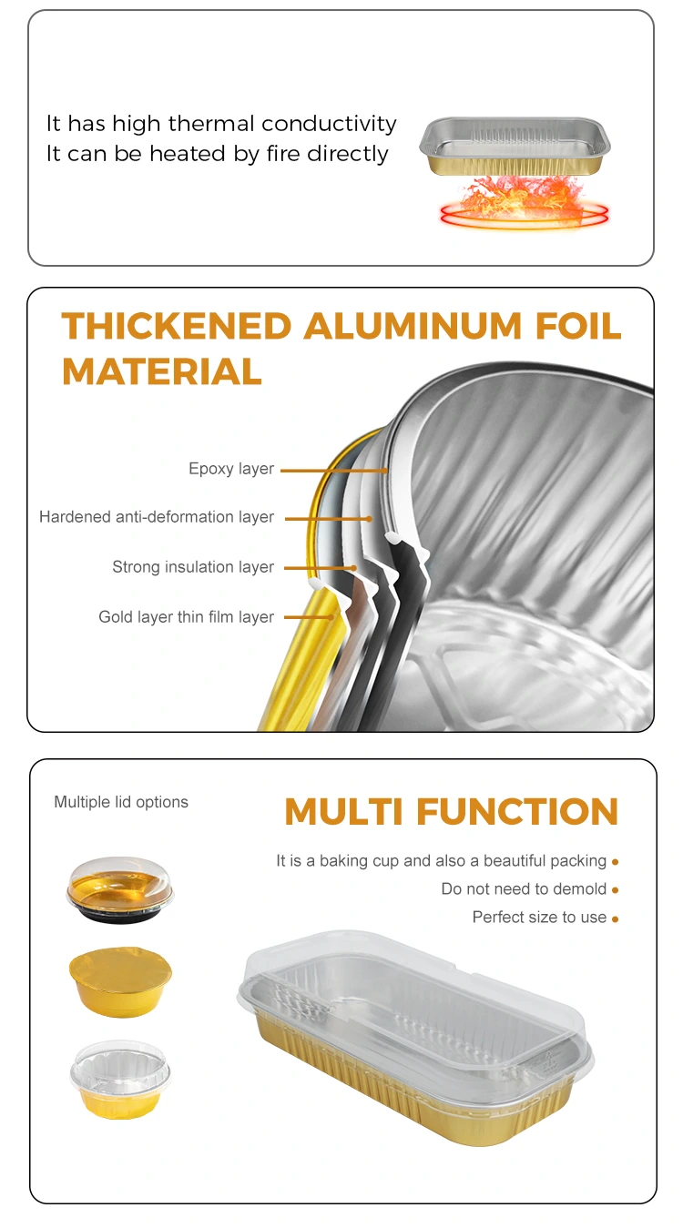 Алюминий фольга материалының керемет жылу өткізгіштігі пештің жылуына тез және біркелкі болуға мүмкіндік береді, сонымен қатар, жергілікті және сэндвичке жол бермейді. Ұзақ қамырды пісірген кезде қораптың денесі тағамның пішініне сәйкес келеді, ылғал мен хош иістен тұрады. Пісірген кезде сыртқы жағынан сыртта қытырлақ, ал ішкі жағынан жұмсақ. Дәмі қарапайым әйнекке немесе пластикалық контейнерлерге қарағанда әлдеқайда жақсы. Қораптың жиектері дөңгелектенеді, бұл сорғышқа төзімді және сорпаның ағып кетуіне жол бермейді. Тікбұрышты алтын пісірілген алтын пісірілген алюминий фольга контейнерлері тұздалған дәмді тағамдарға арналған (лава шоколадтары, карамель жаңғағы).