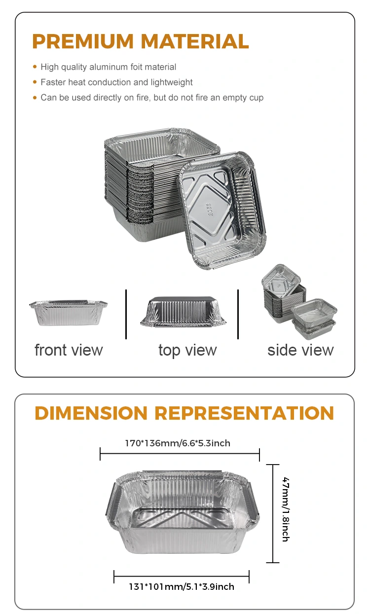 Тікбұрышты гратин - Yunchu алюминий фольга жеткізушісі ұсынған күміс алюминий фольга контейнерлері - жоғары сапалы 8011-0 азық-түлікке арналған күміс материалдан жасалған. Бұл контейнер ауа қуырулары, барбекю, пісіру, пісіру және алдын-ала жасалған тағамдар сияқты әртүрлі әдістерге жарамды және күнделікті өмір үшін тамақты тез қыздыруы мүмкін. Бұл өте икемді, материал күшті және берік, сондықтан деформация немесе сыну оңай емес. Қалыңдатылған дизайнының арқасында бұл алюминий фольга контейнері ашық жалынның жылытуға төтеп бере алады, бұл тұтынушылардың қауіпсіздігін қамтамасыз етеді және қауіпсіз тасымалдау үшін қолайлы және ылғалға төзімділігі жақсы.
