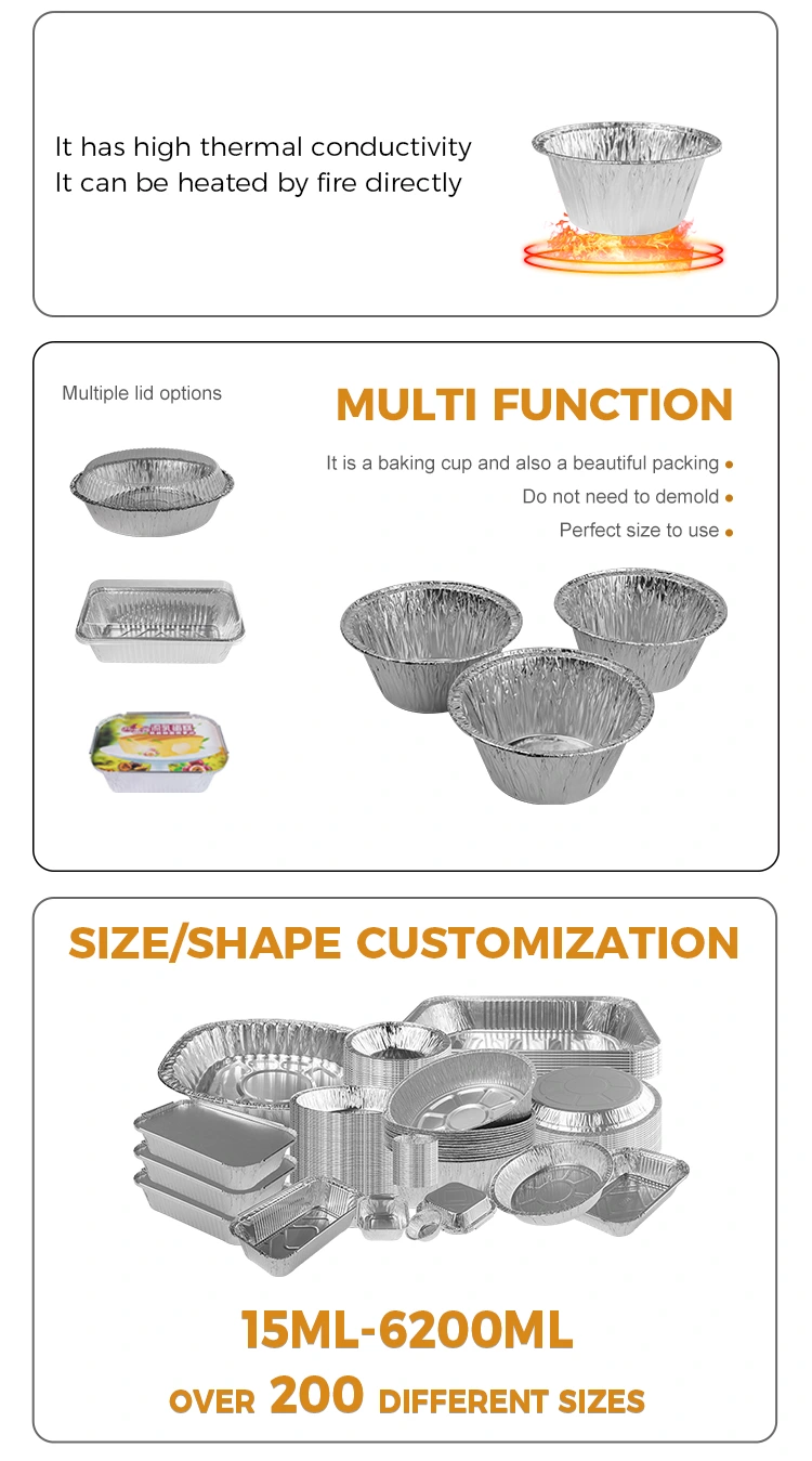Контейнер оның айналасындағы етіп жасалған, контейнердің эстетикасын қабылдауды және қосуды жеңілдетеді. Торттар, нан немесе басқа кондитерлік өнімдерді пісіру ме, бұл фольга контейнері сізге керемет қорғаныс пен ыңғайлылықты қамтамасыз етеді.