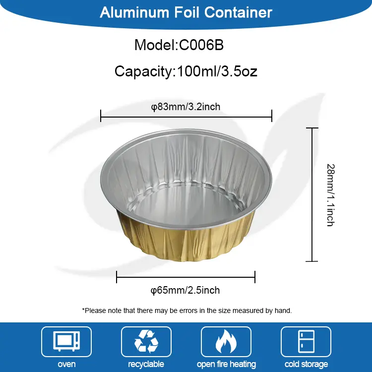 Yunchu алюминий фольга жеткізуші Дөңгелек торт C006B - бұл негізгі шағын және орта мусс, пісірілген тауарлар, пісірілген алюминий фольга қаптамасы контейнері, сыйымдылығы әрқашан бар, ірімшіктеректер, ірімшіктер, мусс торт, тирамису, пудинг, макарон және басқа да тамақ өнімдерін қолдану үшін өте қолайлы. Көбінесе бұл жиі кездесетін алюминий фольгамен салыстырғанда 100ml дизайны өте бай сәйкес келетін кеңістік бере алады, бұл кофеханалар үшін өте қолайлы, бұл десерттерді сату және оны дереу сатып алу және жеуге ыңғайлы ету.